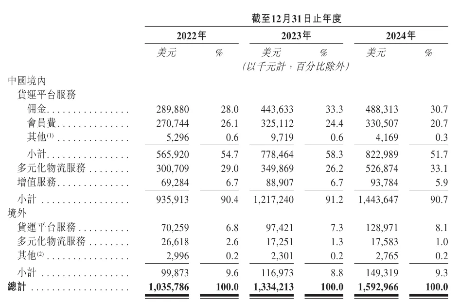2024年,货拉拉在中国境内的营收为14.44亿美元,占总营收的比例为90.7%。分开来看,货运平台服务营收8.23亿美元,占总营收的51.7%,同比增长5.72%,该业务是货拉拉的核心盈利来源。