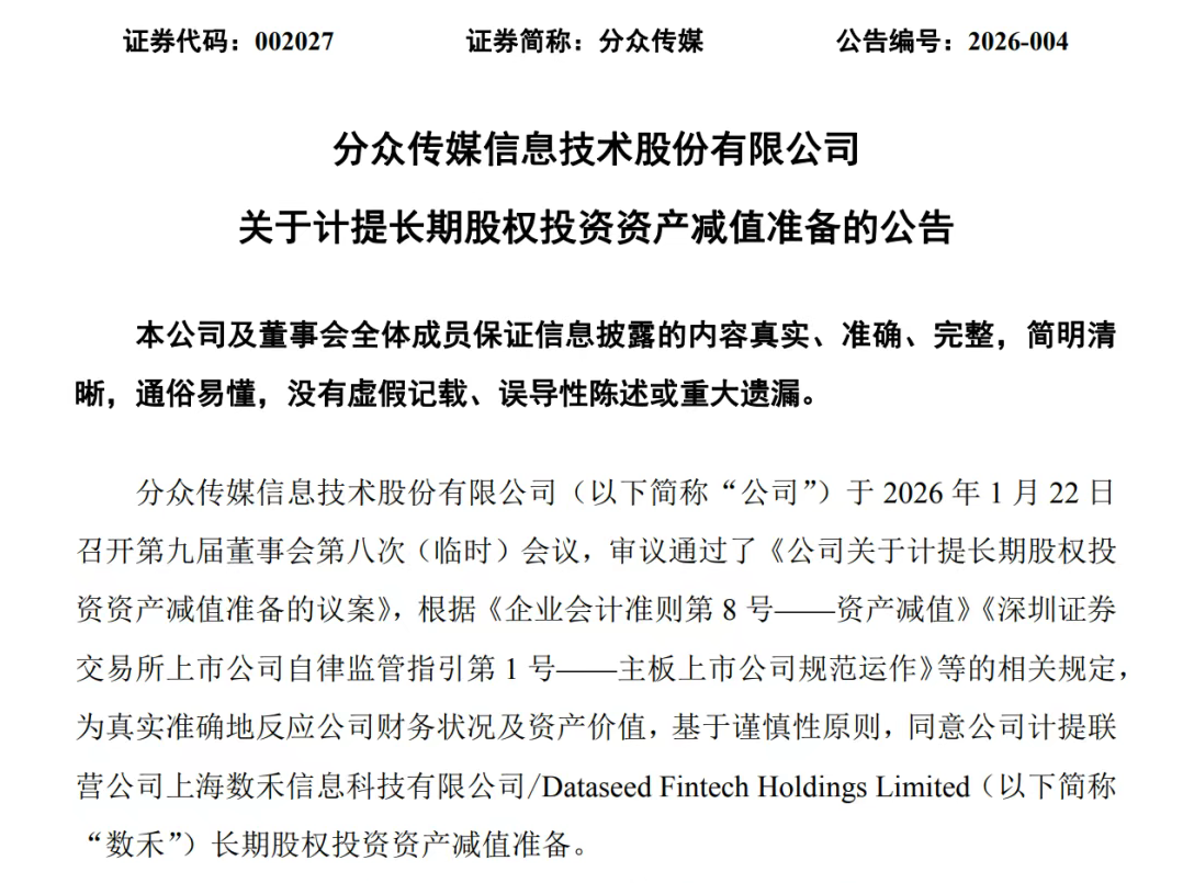 1月24日,分众传媒发布公告,宣布对联营公司数禾科技计提21.53亿元长期股权投资减值准备,并以7.91亿元对价彻底退出该项目。