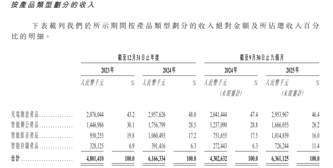 绿联科技的核心业务围绕消费电子全场景展开,构建了充电创意、智能办公、智能影音、智能存储四大产品板块。其中,充电创意业务是当之无愧的“顶梁柱”,主要包括充电器、移动电源(充电宝)及各类充电线材。2023年、2024年及2025年前三季度,该品类收入分别为20.76亿元、29.58亿元和29.54亿元,占总营收比例始终在43%至48%之间。