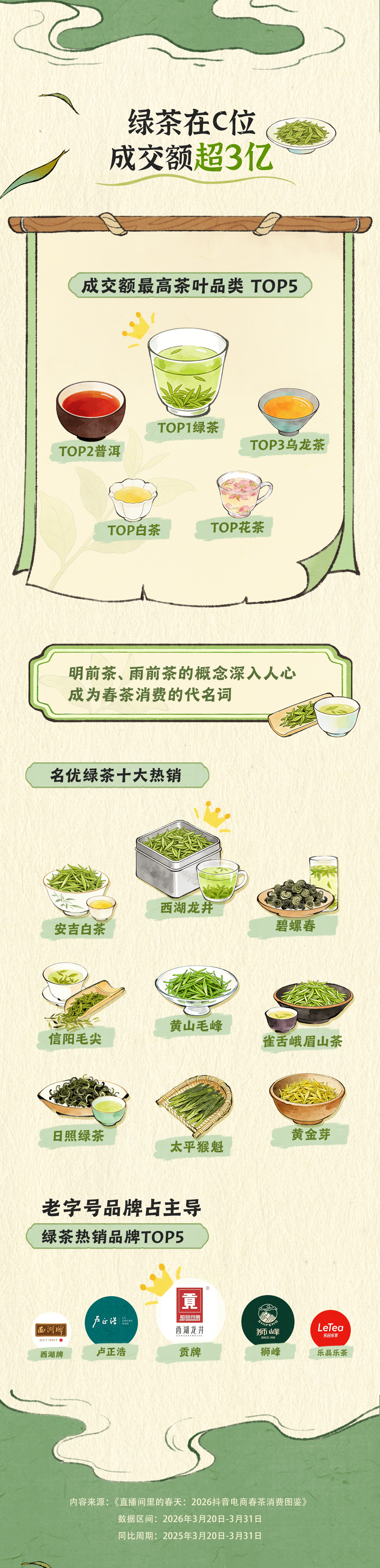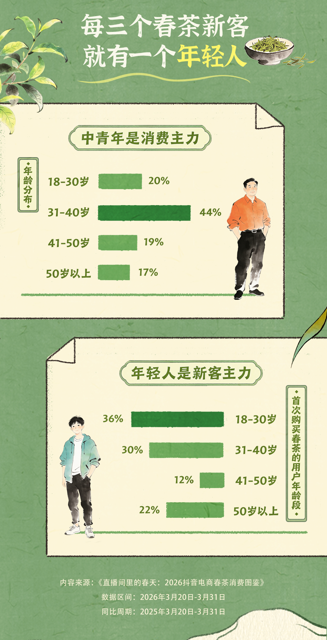 近日,抖音电商发布《直播间里的春天:2026抖音电商春茶消费图鉴》(下称“报告”)。数据显示,2026年3月20日至3月31日,超2.7亿用户走进春茶直播间。每三个新客就有一个年轻人,直播电商正在为传统春茶找到全新的年轻消费群体。