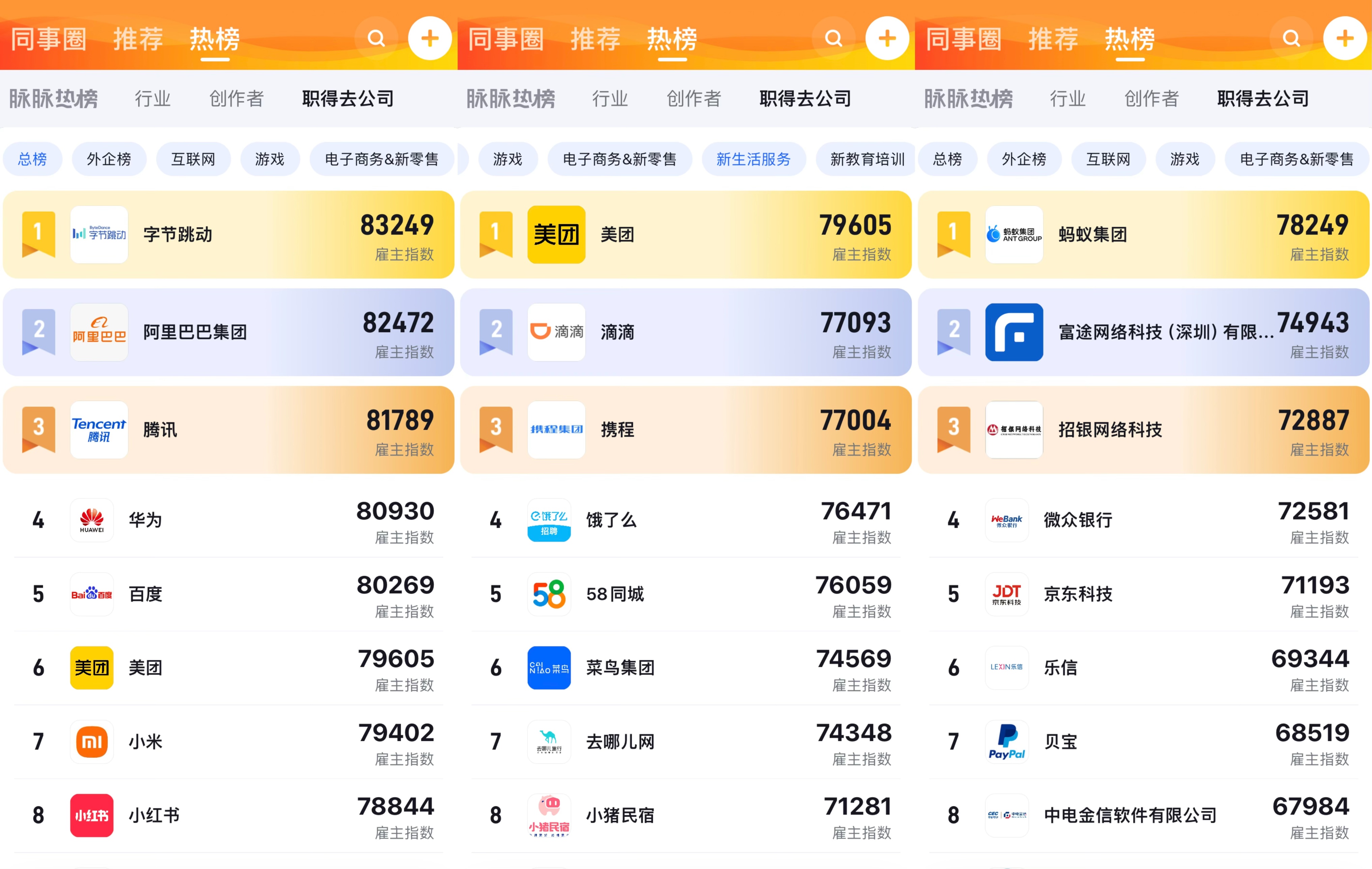脉脉公司当前推出的“职得去公司榜”涵盖了总榜、外企榜和15个行业榜,共计17个分类榜单。在最新排名中,字节跳动荣登总榜首位,蚂蚁集团领跑新金融科技行业榜,而美团则位居新生活服务行业榜首。