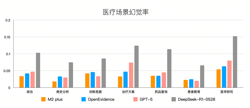 这种“循证驱动”的生成逻辑,让M2 Plus几乎杜绝了无中生有的内容。在多场景评测中,其综合幻觉率在所有大模型当中最低,相较DeepSeek R1最新版降低3倍,显著领先OpenEvidence。不仅如此,在病史分析、诊断思路、治疗方案等真实复杂的核心医疗场景中,达到了与人类资深临床专家同等的可信度。