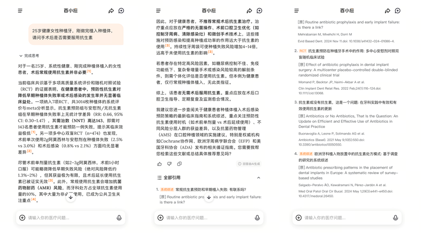 除了需要高效地辅助临床决策,医生还开始面对新的挑战:患者用DeepSeek自诊和带着DeepSeek就医的现象越来越多。虽然知道大模型可能有幻觉和偏颇,但没有时间和精力去甄别哪句对哪句错。通过百小应,医生有了面对通用模型挑战的“专属武器”。