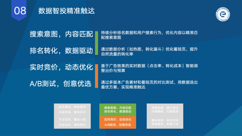 数据智投要做到四点:分析客户搜索意图优化内容匹配度,依据排名与转化数据提升着陆页效果,根据广告实时数据调整出价与预算,通过 A/B 测试选出最优广告素材与着陆页,让每一分营销投入都能高效触达目标客户,提升回报率。
