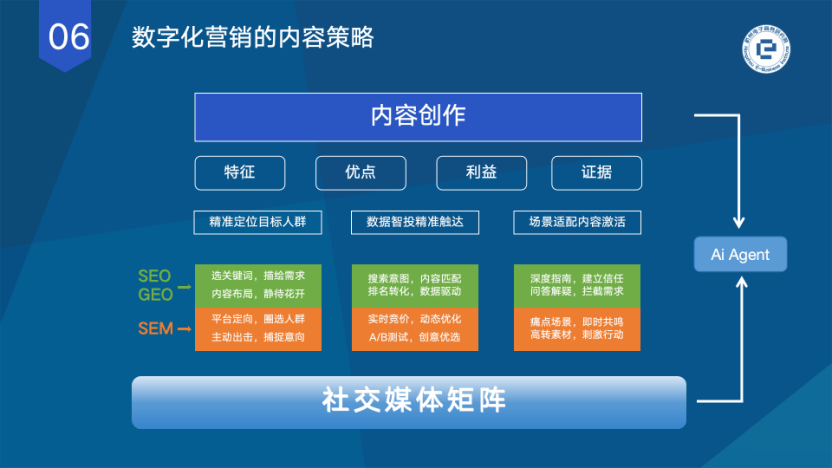 数字化营销的内容策略需按渠道适配:SEO 要选准关键词、布局深度内容等待客户主动搜索;SEM 需实时竞价优化、用 A/B 测试筛选优质创意;社媒矩阵要定向圈选人群主动获客;AI Agent 可制作深度指南、解答疑问拦截需求,全程以数据驱动优化。