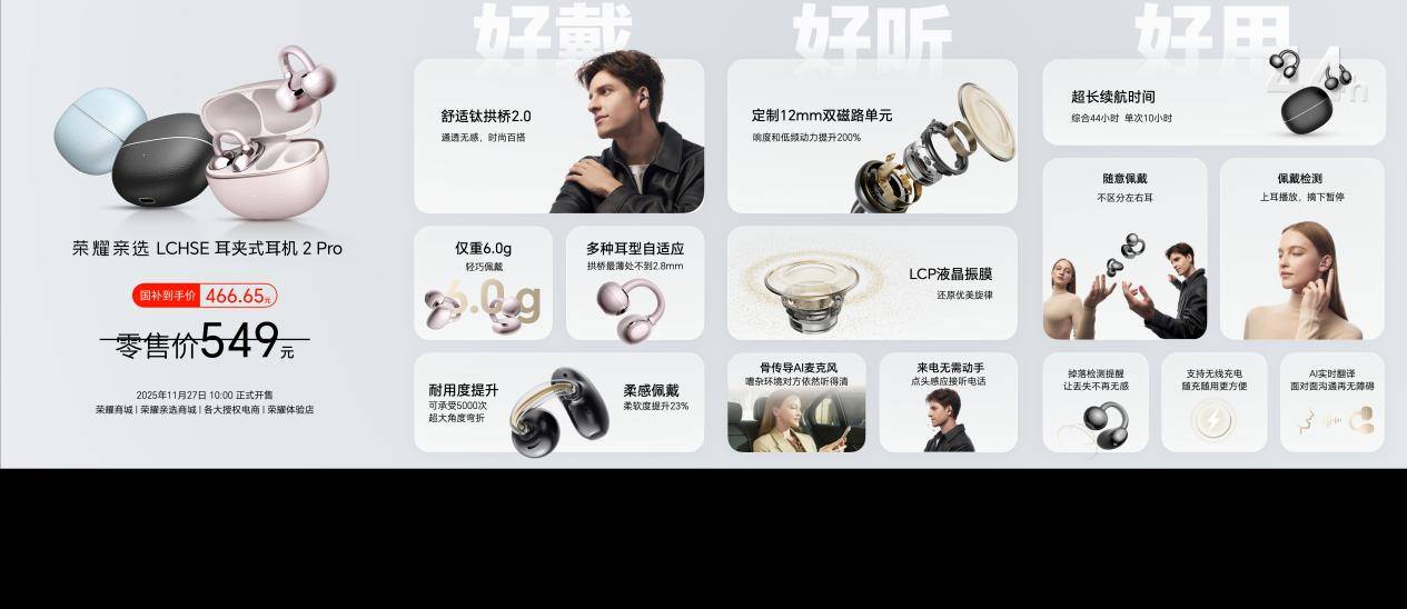 【大力财经】11月24日,荣耀500系列新品发布会重磅举行,正式发布荣耀亲选LCHSE耳夹式耳机2 Pro(以下简称为荣耀耳夹耳机2 Pro)。荣耀耳夹耳机2 Pro在外观设计、佩戴舒适度、音质表现、续航能力、交互体验及AI翻译等方面带来全方位越级体验,是同档位综合性能最均衡的耳夹耳机。荣耀耳夹耳机2 Pro于11月27日10:00全渠道正式开售,国补到手价466.65元。
