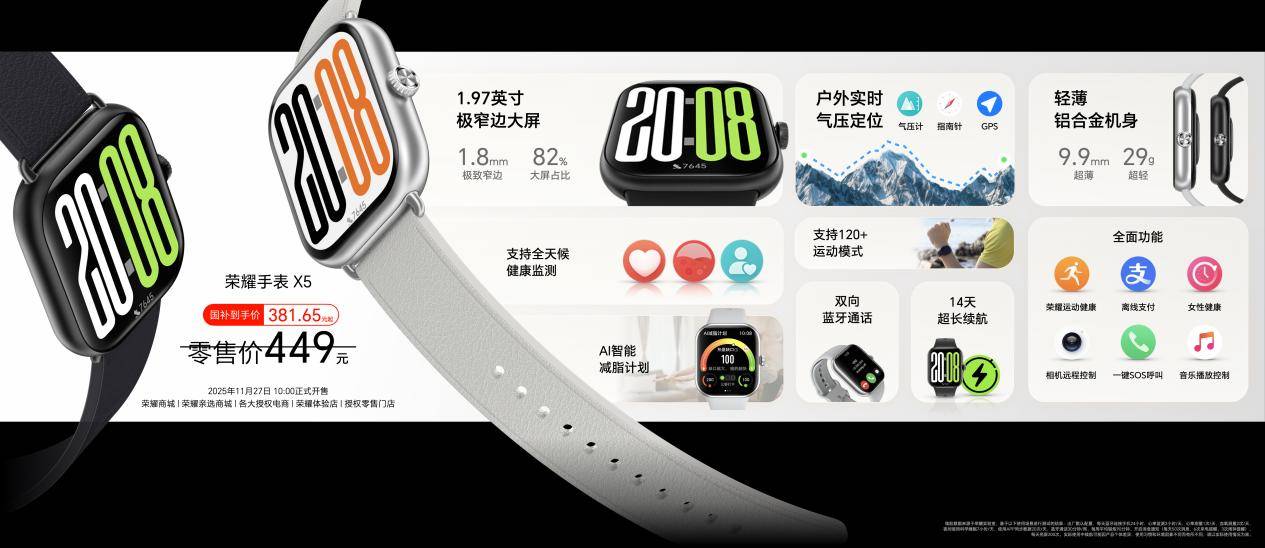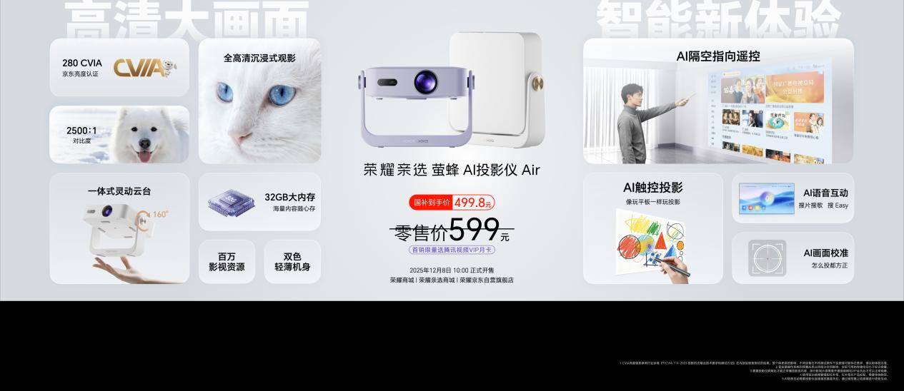 此外,荣耀500系列新品发布会还带来了多款重磅新品。荣耀500系列带来超级标准版和超级Pro版,以2亿人像全能实况、骁龙8系旗舰芯片、8000mAh青海湖大电池超长续航、超美水晶小直屏最强质感,重塑档位标准,为用户带来一步到位的用机体验。荣耀手表X5作为荣耀手表迄今最大屏、最窄黑边、最轻薄的方表,是档位中唯一同时配备游泳级防水、独立GPS的智能手表;荣耀Earbuds S具备深度降噪、空间音频,拥有超长续航;荣耀亲选萤蜂Al投影仪Air获得京东亮度认证,投影表现更亮更清晰,搭载创新AI 智能操控,带来全新操控交互体验,点得准,更玩得爽!