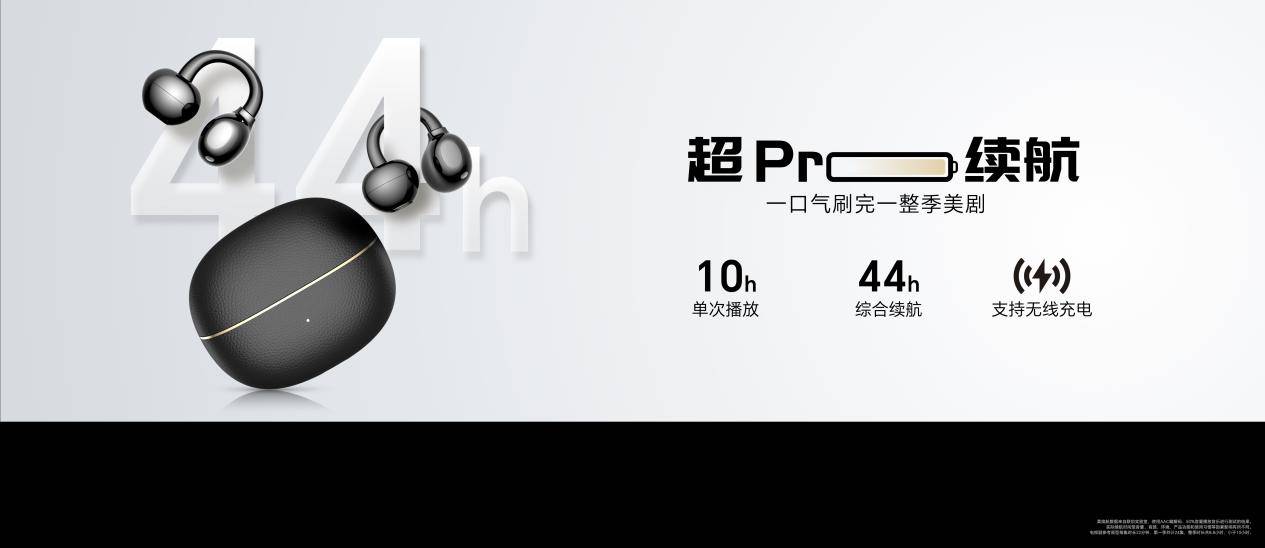 荣耀耳夹耳机2 Pro综合续航长达44小时,单次播放可达10小时,大幅领先同类产品的续航能力,充满一次电,就可实现一口气刷完一整季美剧,并支持无线充电与快充两种功能,其中快充功能实现充电10分钟使用3小时,彻底告别续航焦虑。