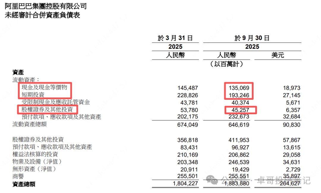 阿里现金及现金等价物1351亿元+短期投资1932亿元+流动资产中的股权证券及其他投资453亿元=3736亿元。