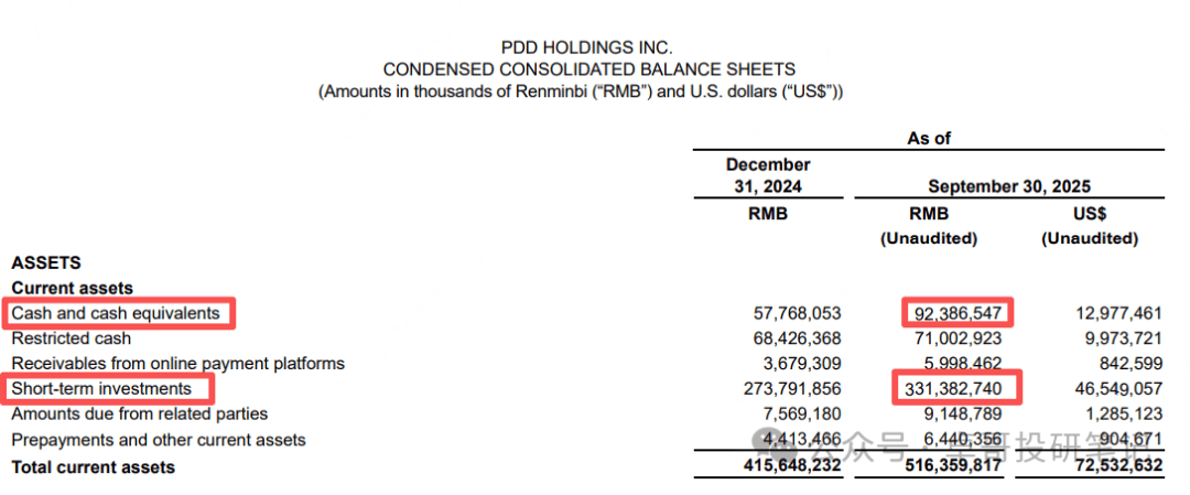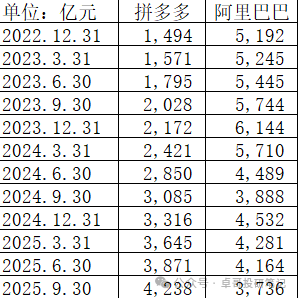 如截至2025年3季度末,多多现金及现金等价物924亿元+短期投资3314亿元=4238亿元。