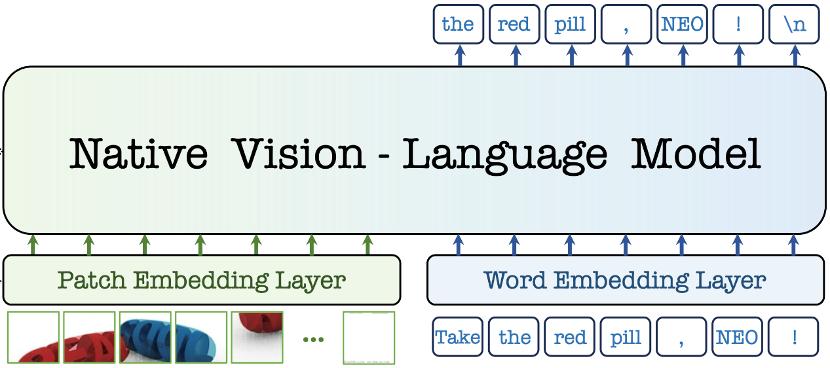 原生图块嵌入 (Native Patch Embedding): 摒弃了离散的图像 tokenizer,通过独创的 Patch Embedding Layer (PEL) 自底向上构建从像素到词元的连续映射。这种设计能更精细地捕捉图像细节,从根本上突破了主流模型的图像建模瓶颈。