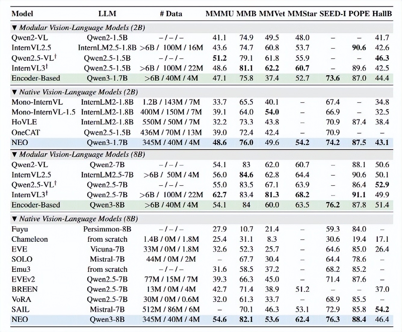 性能卓越且均衡: 在 MMMU、MMB、MMStar、SEED-I、POPE 等多项公开权威评测中,NEO 架构均斩获高分,展现出优于其他原生 VLM 的综合性能,真正实现了原生架构的“精度无损”。