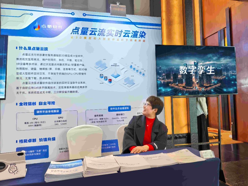 展会期间,点量软件团队向与会嘉宾及行业同仁重点展示了公司明星产品——“点量云流”实时云渲染。通过详实的讲解与演示,团队系统介绍了该产品在降低硬件门槛、实现大规模三维场景高效协同访问、支持多终端多并发的流畅交互等方面的核心能力。产品可广泛应用于数字城市、工业仿真、智慧园区、虚拟教育培训等高精度、高复杂度可视化场景,其背后的高画质低延迟、高性能编解码、负载均衡及弹性资源调度等核心技术,成为支撑数字孪生应用落地与沉浸式体验的关键。团队亦分享了该技术在未来与人工智能、大数据进一步融合,推动数字孪生向实时化、智能化、普及化发展的前瞻性思考。