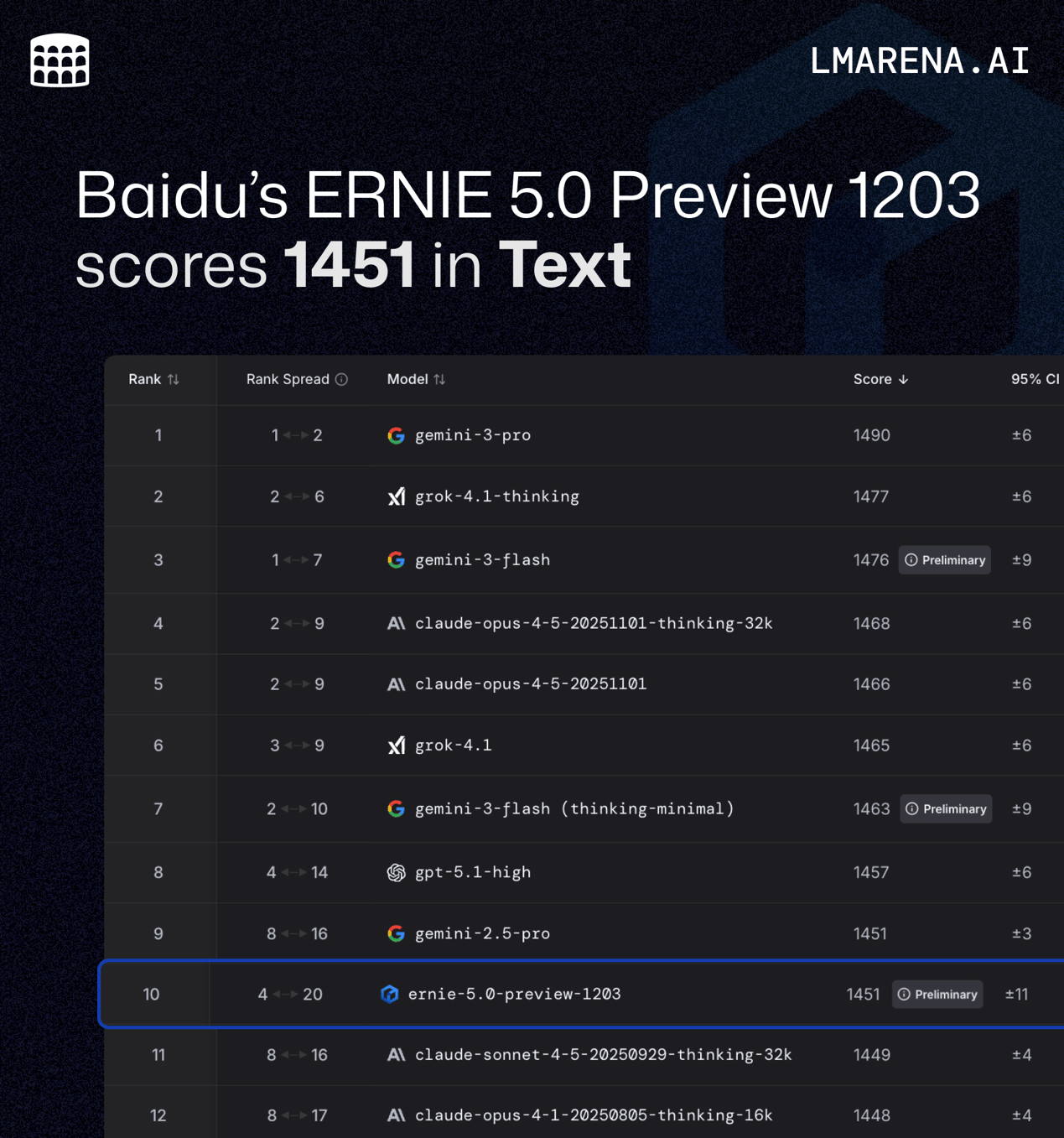 12月23日,LMArena 大模型竞技场发布最新排名,文心新模型 ERNIE-5.0-Preview-1203 以 1451 分登上 LMArena 文本榜,排名中国第一。在创意写作、高难度指令等方面表现突出,超过Claude-Opus-4-1、GPT-5.2、GPT-5.1、和Qwen3-Max-Preview等多款国内外主流模型。