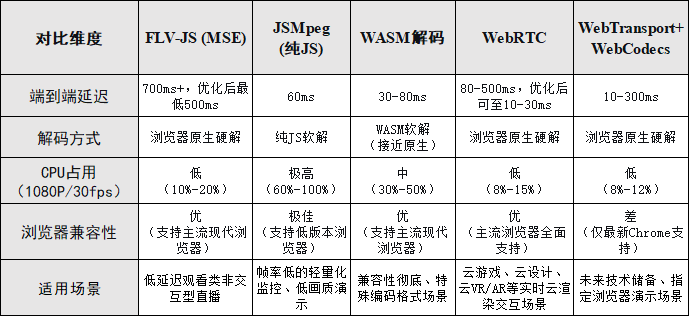 核心特点:传输延迟与WebRTC相当,甚至在部分场景下更优;编解码逻辑可深度定制,适配特殊画质与帧率需求。但目前兼容性极差,仅支持最新版本的Chrome浏览器,Safari、Firefox等浏览器暂不支持,暂时无法满足实时云渲染的全终端适配需求,仅适用于指定浏览器的特殊演示场景,暂不具备大规模商用价值。