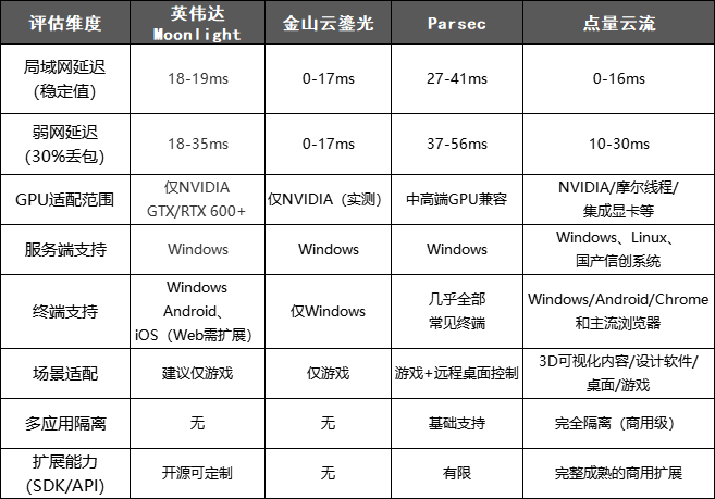 本文就给大家带来这一领域真实的多个产品的介绍,并基于真实硬件环境与统一测试标准,对英伟达Moonlight、金山云鎏光、Parsec及点量云流四款主流方案进行实测对比,从延迟、兼容性、功能完整性等核心维度展开分析,既呈现各方案的技术特点,也为行业选型提供客观参考。