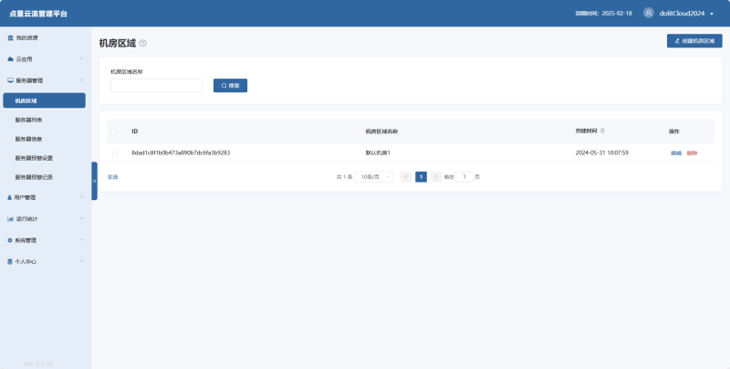 3、点击“创建机房区域”按钮可创建新的机房区域,在服务器列表页面可对服务器所属的区域进行编辑。