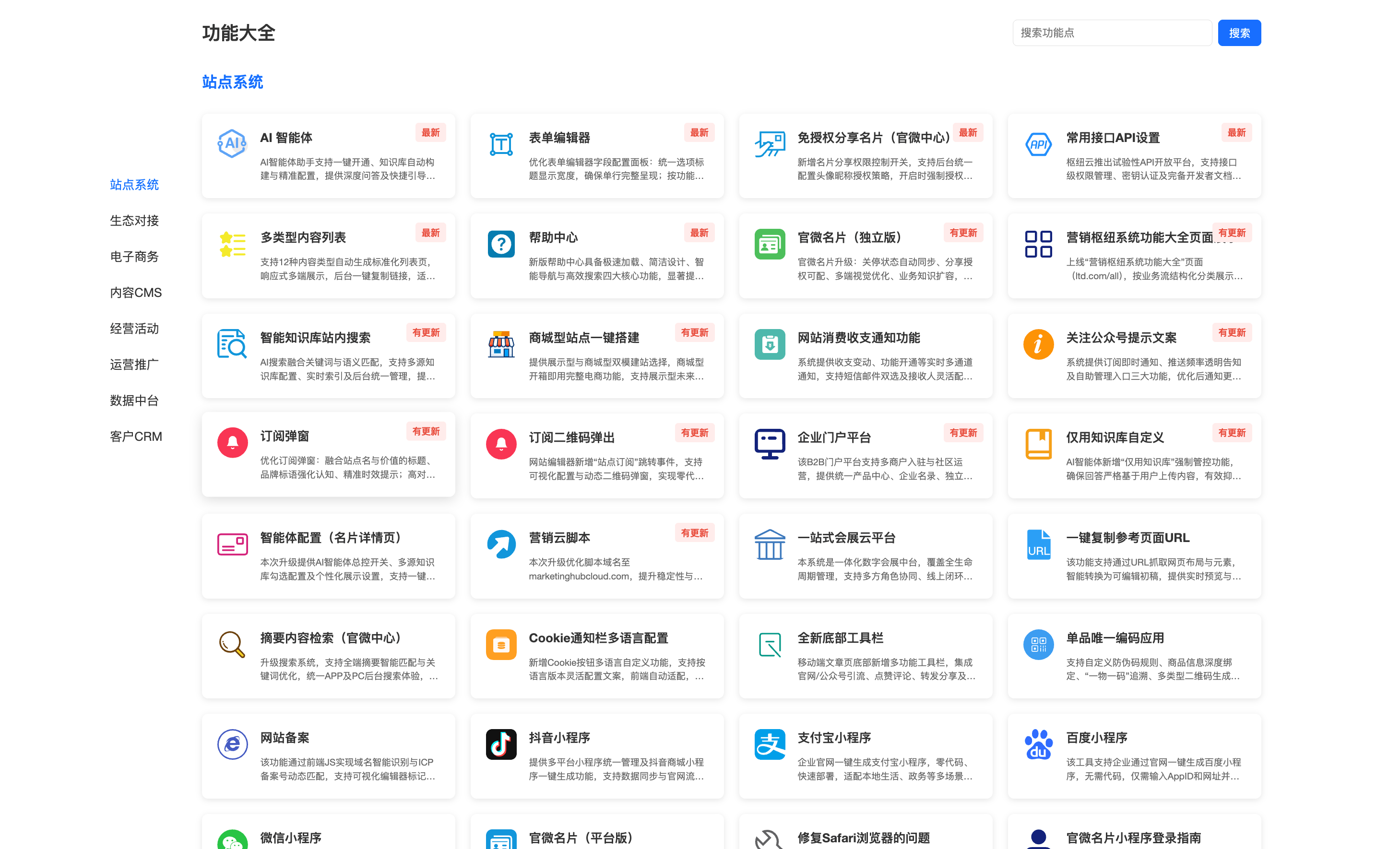 以 LTD.com 的营销云系统为例,其四大能力(官网宣发、物料营销、链接撩客、数据中台)以及所集成的AI功能,就能够很好的满足这些要求。