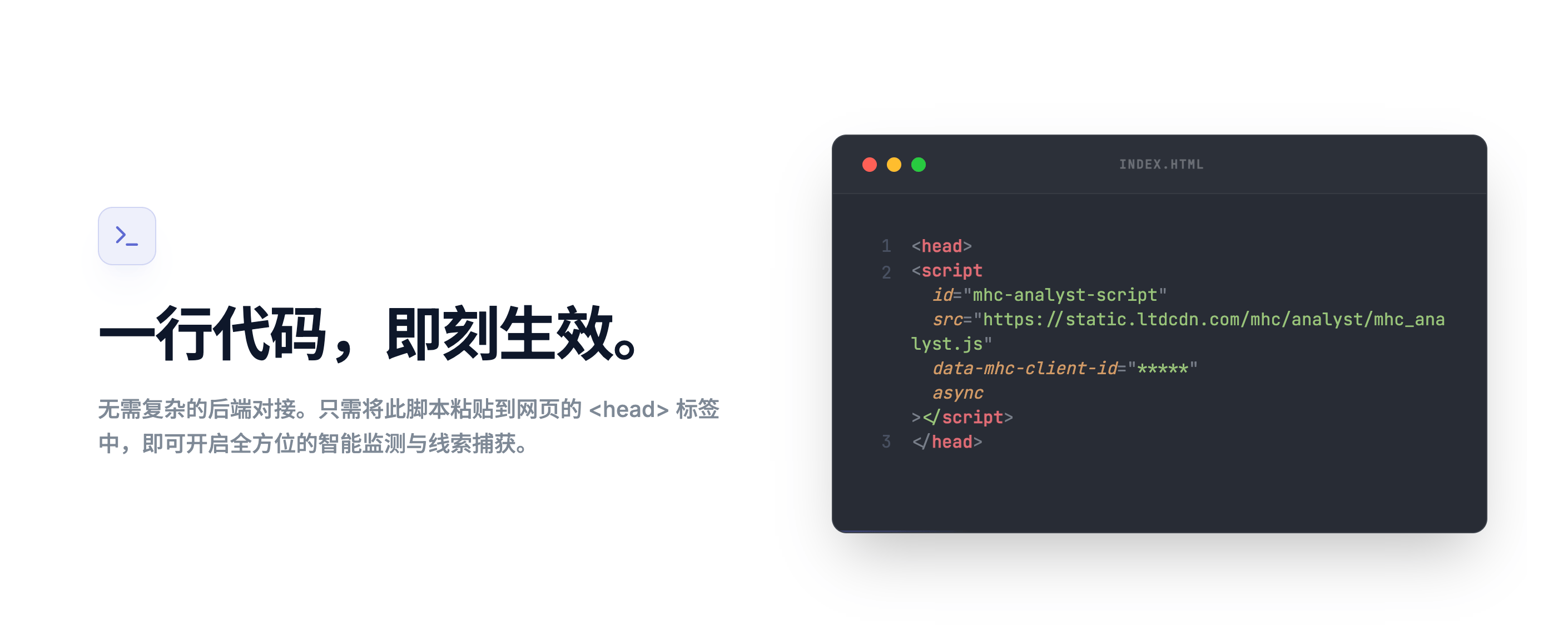 针对存量网站,一开始并不需要全部推倒重来,我们可以用更加轻量的集成办法。比如枢纽云系统即将推出的 营销枢纽云 | MarketingHubCloud | 站点智能 营销云插件,只需在您现有的老网站代码中,嵌入一行JS代码(就像安装网站统计代码一样简单),即可瞬间为老网站装上“AI大脑”: