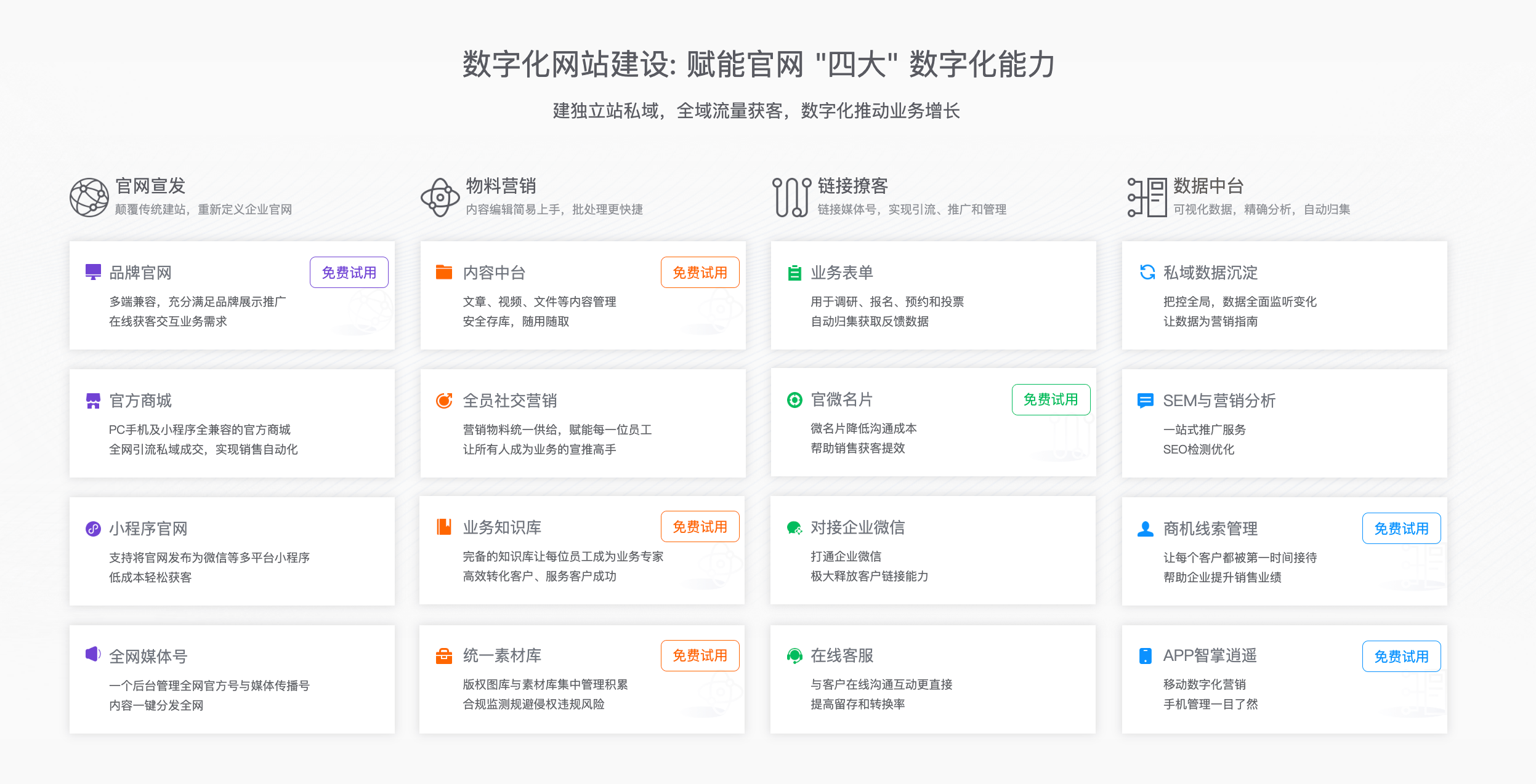 3.消除“信息孤岛”:告别建站找一家、CRM找一家、客服找一家的割裂局面,最好能实现从引流到成交的一站式系统,使用一份数据、一个后台来进行管理。