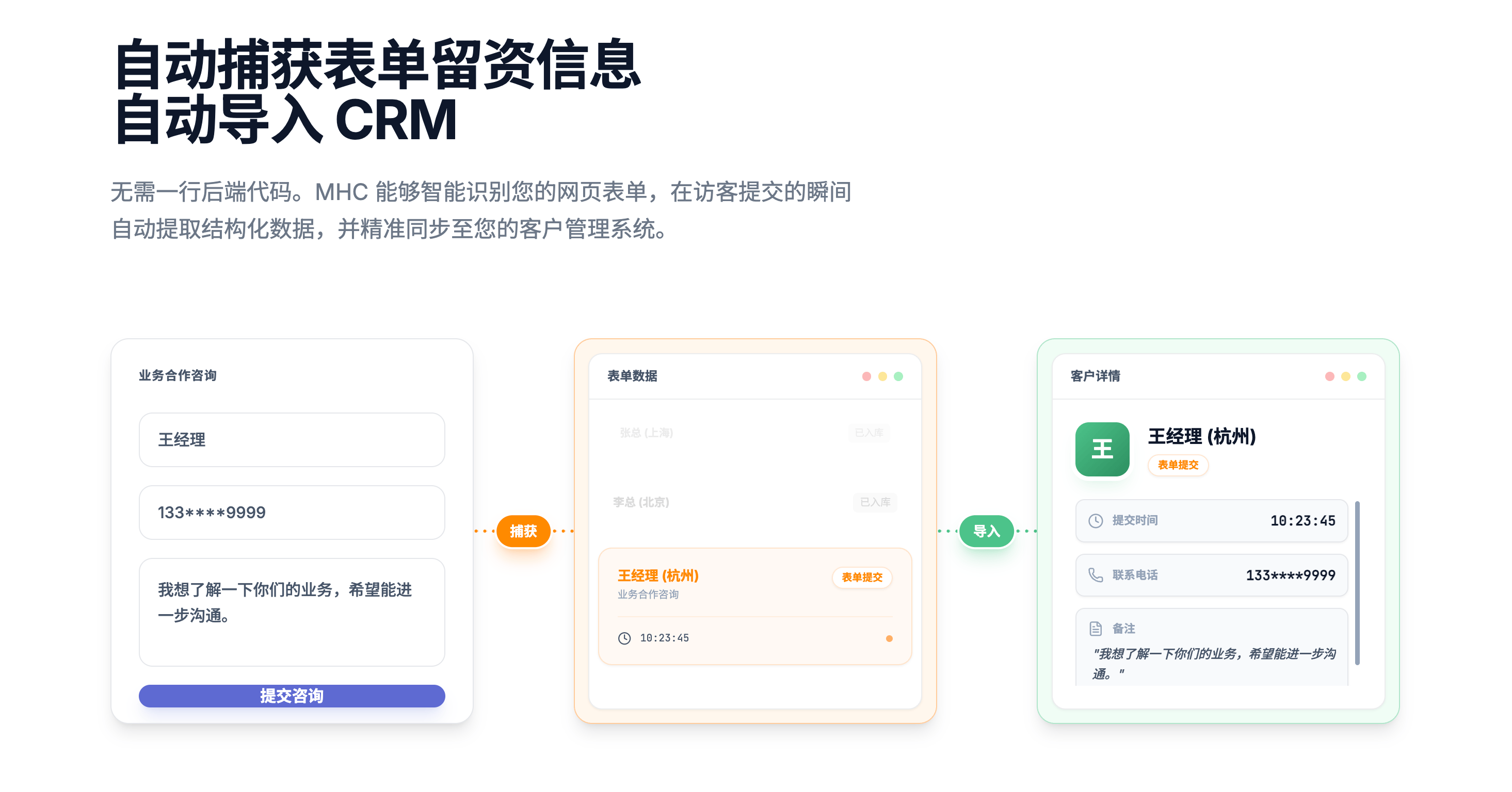 3. 全域线索归集: 将老网站上散落的表单、在线咨询数据,自动汇聚到统一的云端CRM系统中,告别手工账。