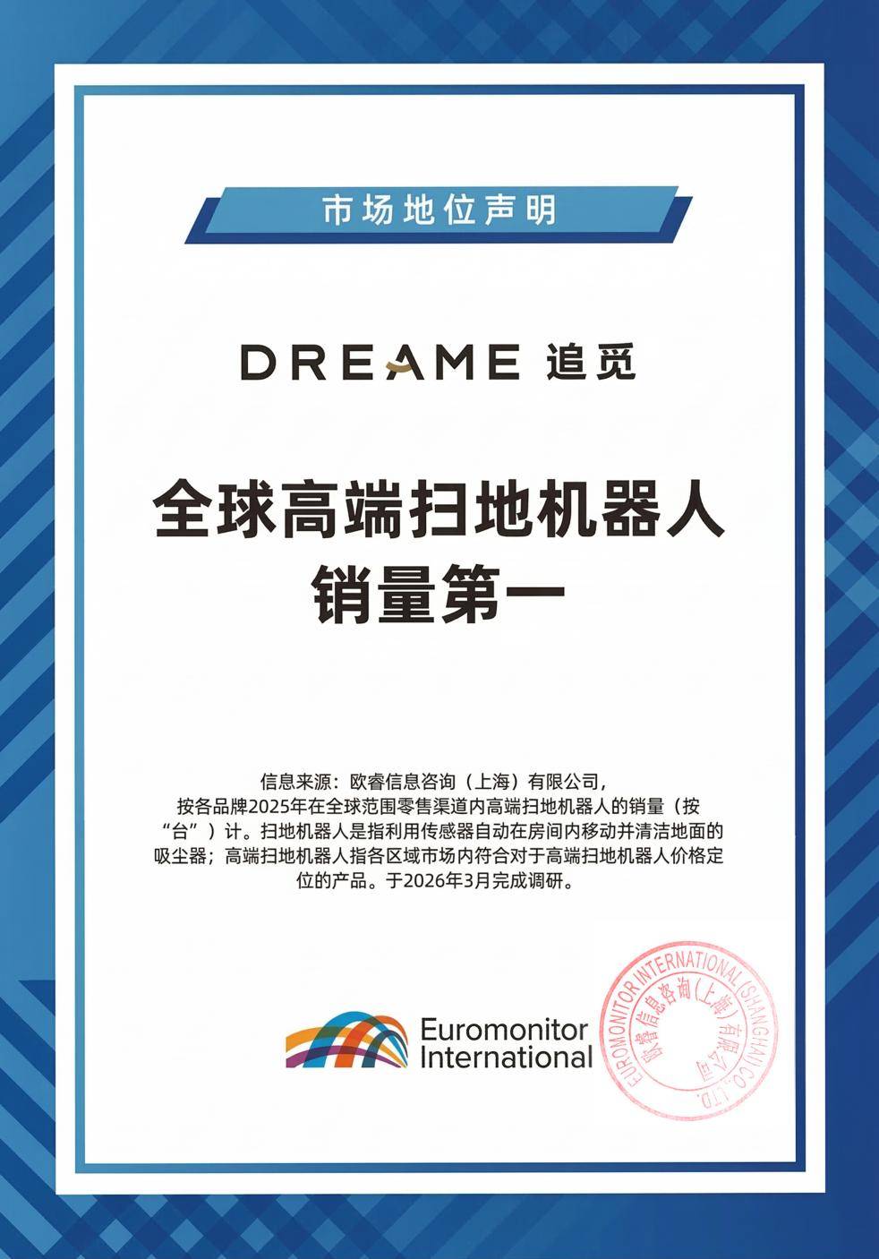 3月12日,追觅扫地机斩获欧睿国际权威认证——全球高端扫地机器人销量第一。追觅扫地机以断层领先的绝对优势,成为全球高端消费人群首选