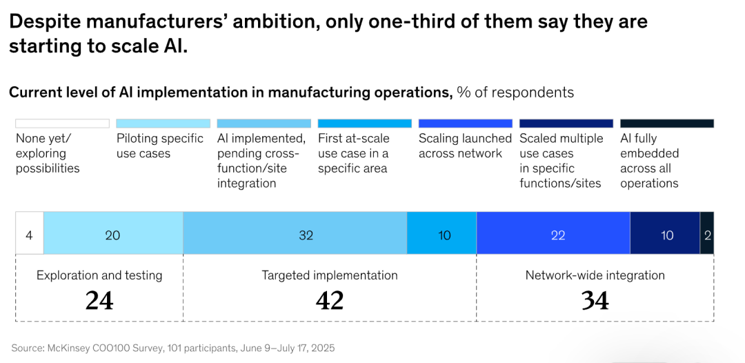 麦肯锡《2025 年全球工业数字化转型报告》数据显示,全球制造业企业中,仅有 2%的企业,将AI 完全嵌入所有运营环节,32% 的企业虽已完成单点实施,但待跨功能集成。
