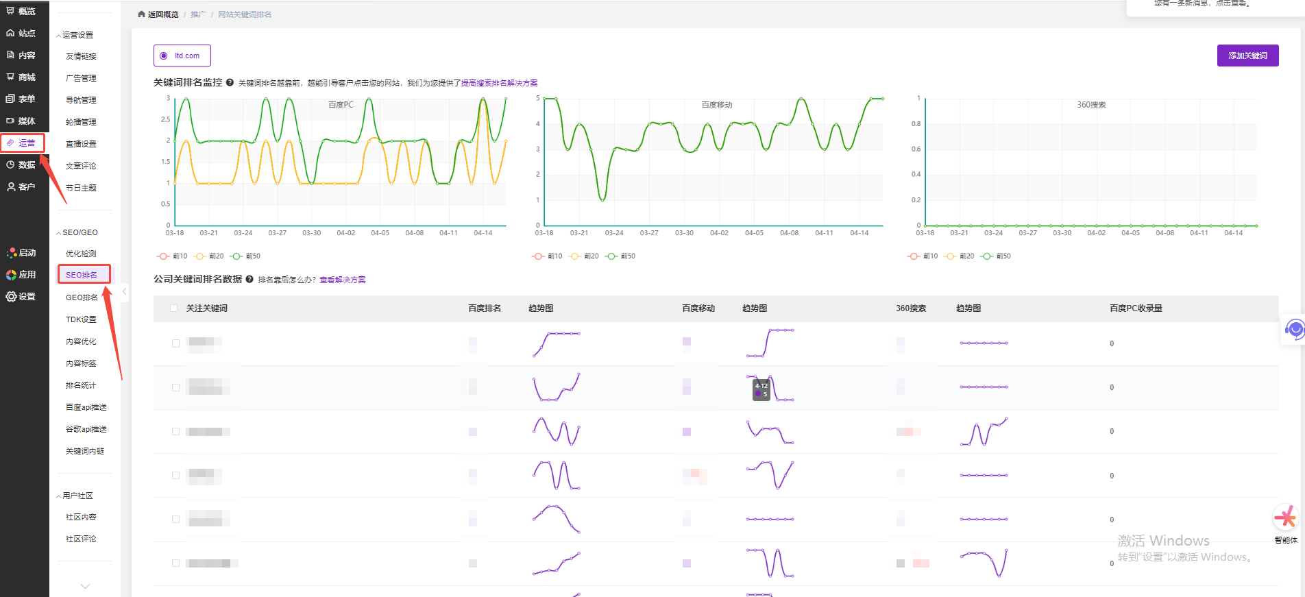 做营销最怕花钱没水花。系统后台可以通过“运营—SEO关键词排名”直接监控SEO数据。不管是百度PC端、移动端还是360搜索的排名情况,都有直观的趋势图表呈现。流量涨跌、排名起伏全盘掌控,让您的每一分投入都有迹可循。