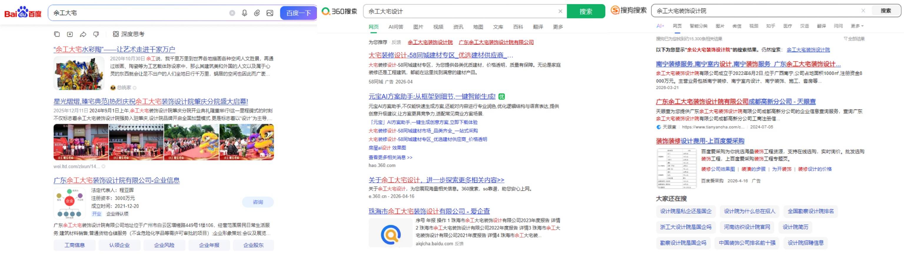 1.广东余工大宅装饰设计院有限公司(未做SEO):在客户搜索时官网无法在首页被直接推荐