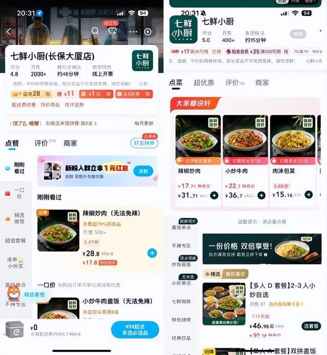 此次入驻美团、饿了么的是“七鲜小厨”长保大厦店,位于北京东城区。页面信息显示,该店目前提供自提及外带服务,单人餐价格多在二十多元,还有十元以下的饮品可选。
