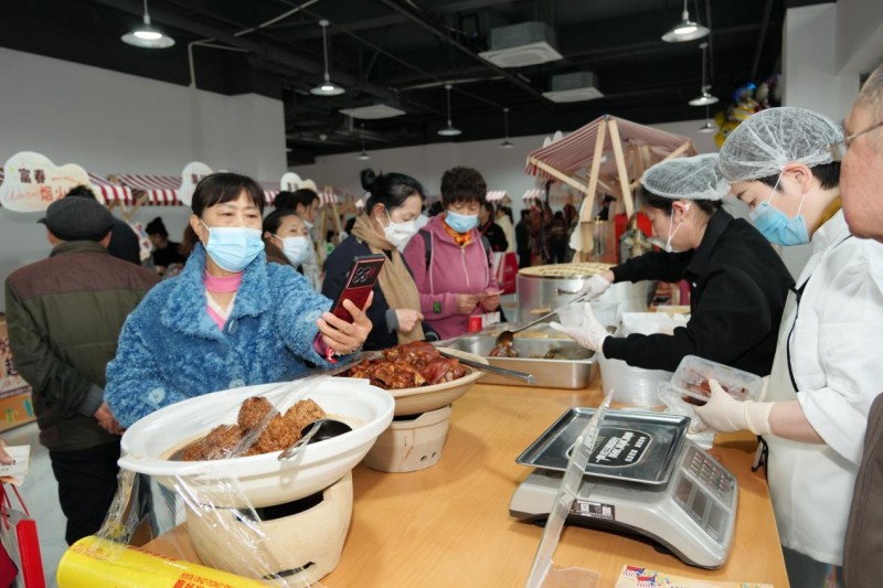 美食体验区堪称全场“人气担当”,慢炖滋补汤、低糖水果等适老美食,遵循低盐低糖、软烂易嚼的标准,精准匹配长者饮食需求;酱货、公寓餐厅招牌餐品、富阳本地特色小吃等丰富品类,则兼顾邻里口味偏好。工作人员热情递上试吃品,不少居民边尝边赞,直言“味道地道、选择多样,特别对胃口”。