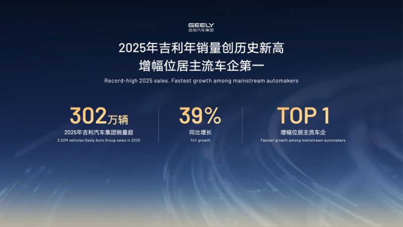先看最硬核的数据——吉利汽车集团公布累计销量完成302万辆,创下历史新高,同比增长39%,增幅位居主流车企第一位。