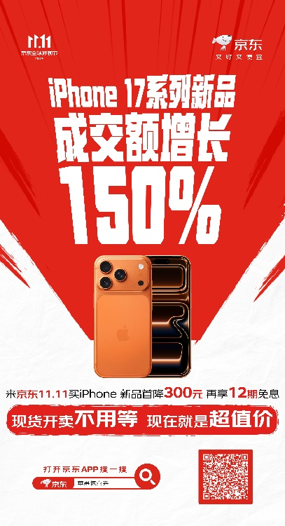 今年京东11.11,海量重磅新品集中上新。以iPhone 17系列为代表,在新品首降300元、再享12期免息的福利叠加下,京东11.11开启以来,iPhone 17系列新品成交额同比增长高达150%。