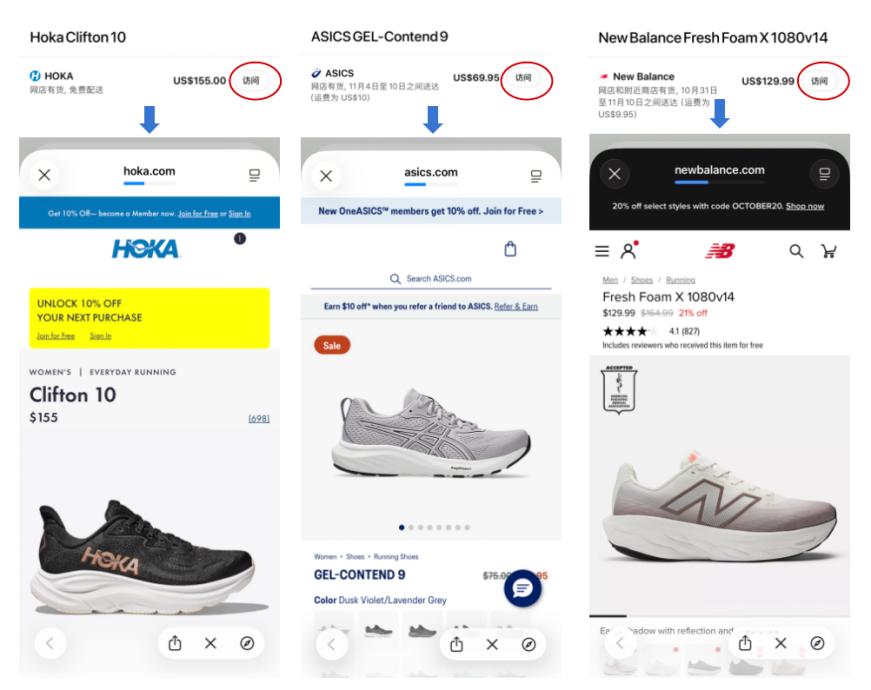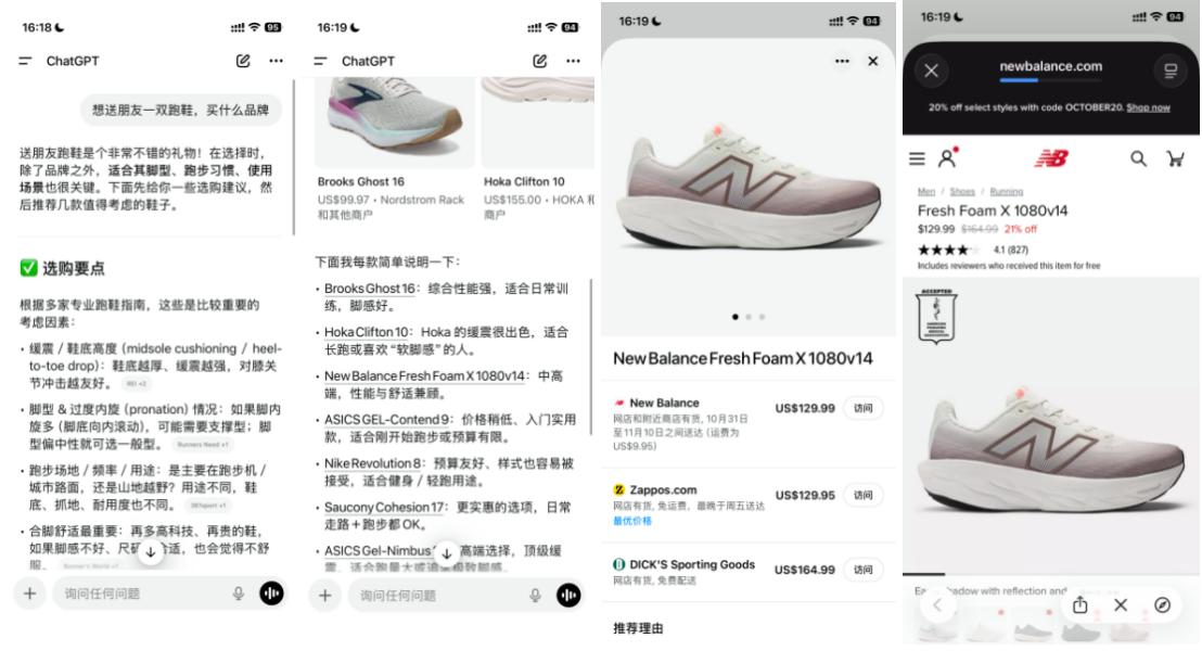 很快,回答中出现了Hoka、New Blance、ASICS、Nike等推荐选项。ChatGPT不仅详细介绍了每款鞋的功能和脚感,还贴心地标注了售价。并引导用户点击“访问”,直接跳转至品牌官方商城完成下单(未来,用户甚至无需跳转,在ChatGPT界面中即可完成支付)。
