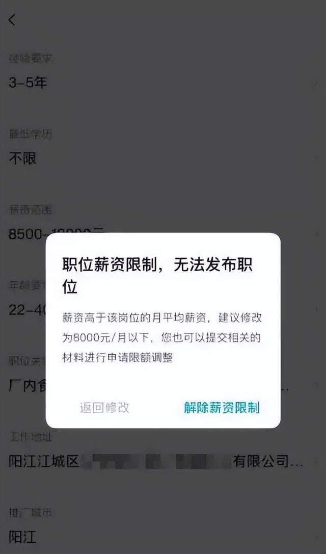 目前,这家阳江企业的岗位已在 BOSS直聘 正常发布。但围绕“高薪反被拦”的讨论仍在继续。如何在保障真实信息与尊重个体企业差异之间找到平衡,也考验着招聘平台的机制设计。