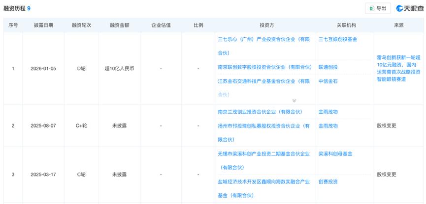 在此背景下,作为行业翘楚,雷鸟创新已然成为资本的宠儿。天眼查显示,2021年成立以来,雷鸟创新共完成9轮融资,其中D轮融资完成于2026年1月5日,融资金额超10亿元。对比而言,主营互联网电视业务的雷鸟科技已成立约九年时间,仅2017年2月和2019年1月拿到过两轮融资。