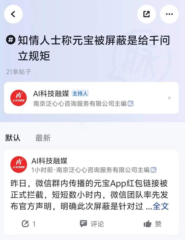 2月5日,脉脉APP上有网友爆料称,微信近期对腾讯元宝App红包链接的屏蔽动作,核心目的是为即将开启大额红包活动的阿里千问等竞品“立规矩”,为后续平台生态管控铺垫基础。