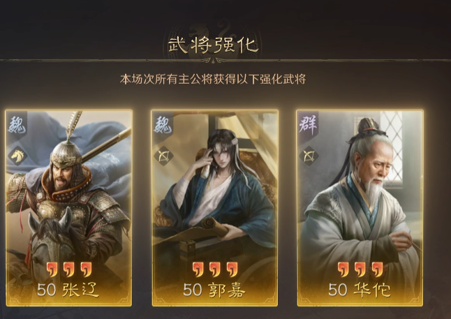 每轮对战还设置了随机武将强化与专属战场特性,既避免了队伍同质化,又加深了配队策略的深度——玩家可以借助特性加成打造联动阵容,每轮随机刷新的三名强力强化武将,也考验着主公们的配队思路,合理搭配才能锁定胜局。
