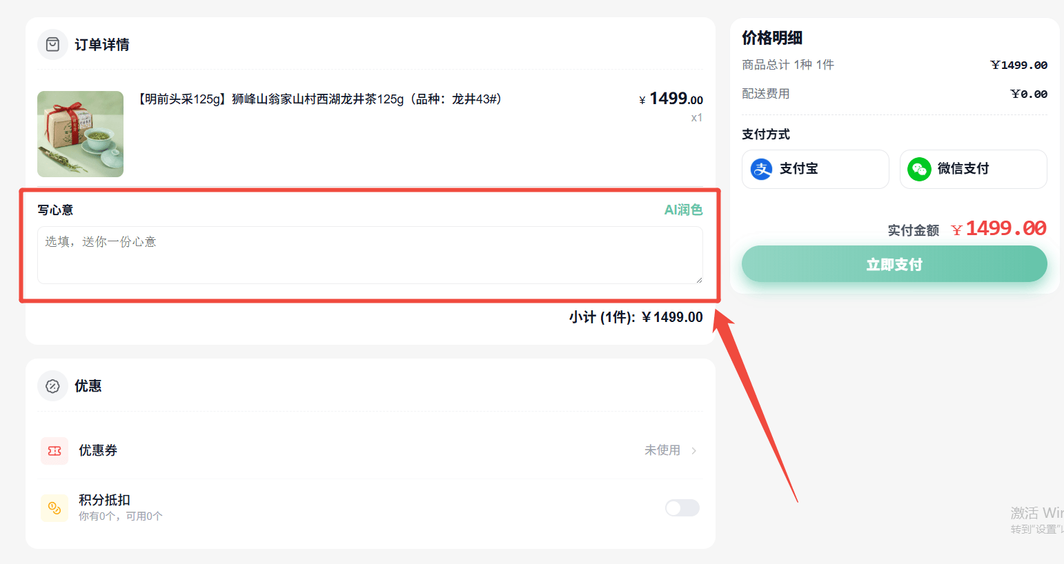 进入订单页后,您会看到一个专属的【写心意】文本框。在这里,您可以留下对亲友的问候。