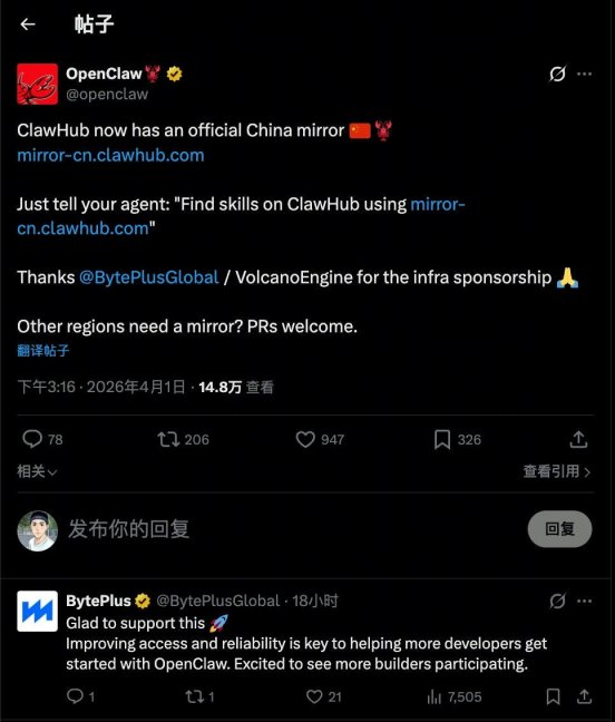 OpenClaw在X平台官宣:在火山引擎的支持下,ClawHub中国镜像站正式启动运营!点击 http://mirror-cn.clawhub.com/ 可以直接跳转到该镜像站。
