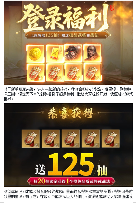 对于新手玩家来说,进入一款新的游戏,往往会担心起步难、发展慢。别愁啦,《三国:谋定天下》为新手准备了超多福利,能让大家轻松开局,快速融入游戏世界。