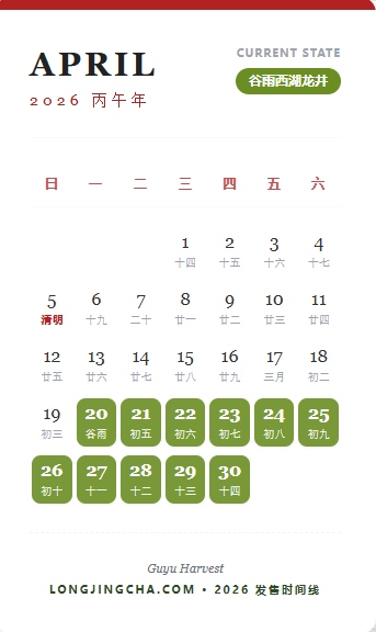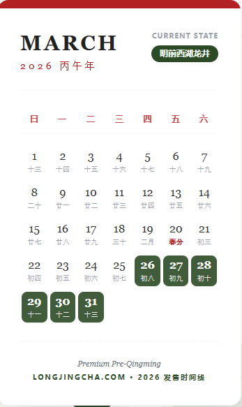 我们坚持“品质、纯正”的理念,完全顺应大自然的节气来制定我们的采摘与发货标准。为了让大家清晰地了解手中的茶处于哪个绝佳的状态,我们在此分享Longjingcha.com专属的2026年采茶时间线: