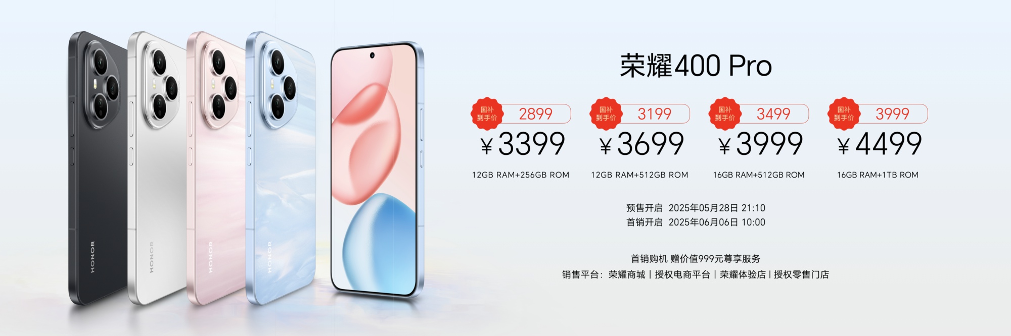 据「TMT星球」了解,荣耀400系列共两个版本,分别为荣耀400与荣耀400 Pro,国补后起售价分别为2124.15元、2899元,目前已经开启预约,6月6日10:00全渠道正式开售。