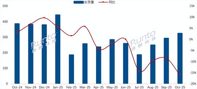 根据洛图科技(RUNTO)最新发布的10月《中国电视市场品牌出货月度快报》,2025年10月中国电视市场品牌整机出货量约为324万台,相比去年同期大幅下降16.0%,创下今年以来的最大单月跌幅。