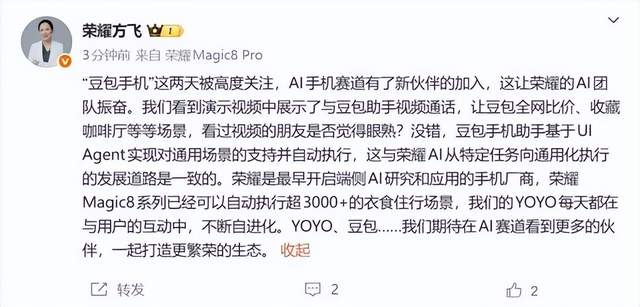 12月4日,荣耀终端股份有限公司产品线总裁方飞在微博发文表示,“豆包手机”这两天被高度关注,AI手机赛道有了新伙伴的加入,这让荣耀的AI团队振奋。