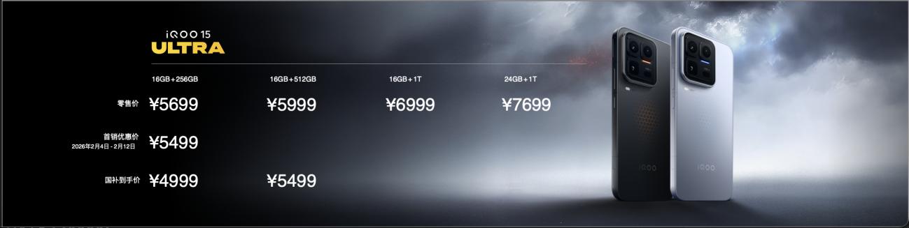 iQOO 15 Ultra 共有 4 个版本可供选择,16GB+256GB 版本首销优惠价 5499 元( 2 月 4 日-2 月 12 日);16GB+512GB 版本零售价 5999 元,两个版本均能再享受至高 500 元的国补优惠。还有 16GB+1TB 版本售价 6999 元;24GB+1TB 版本售价 7699 元可选。所有购买用户尊享至高 24 期分期免息、五年风扇宝,以旧换新享大额补贴等丰厚权益。